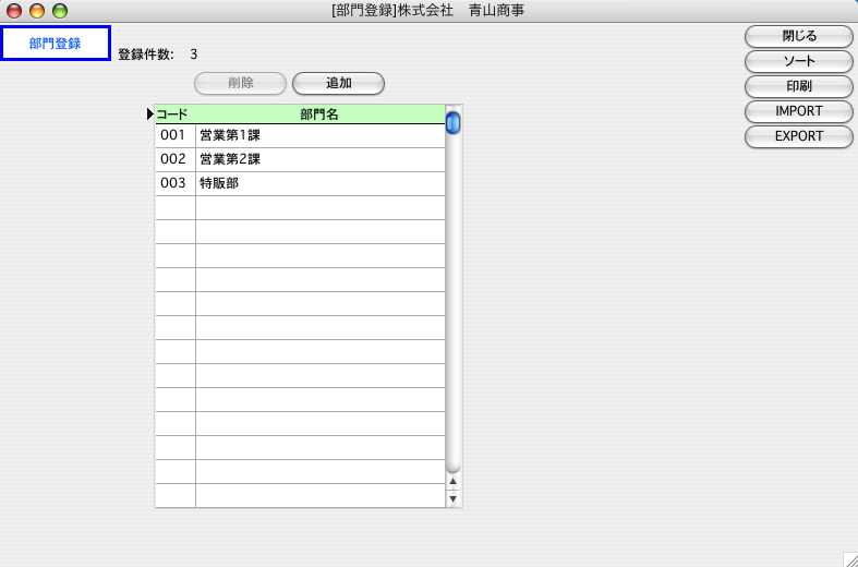●「追加」ボタンで明細行を追加し、部門コード3桁、部門名を漢字15文字以内で入力します。
