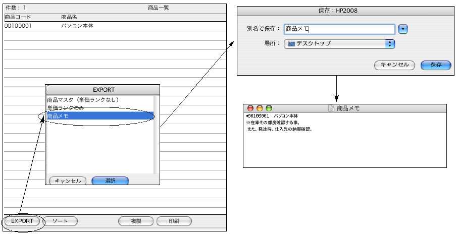 登録した商品メモをTEXT形式にEXPORTする事ができます。