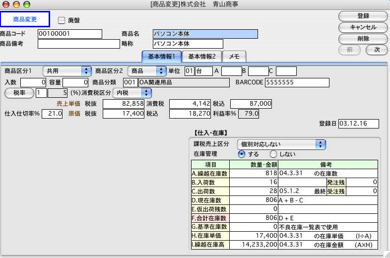 商品の確認・変更・削除は、その商品を一覧からダブルクリックして変更画面で操作します。