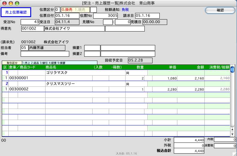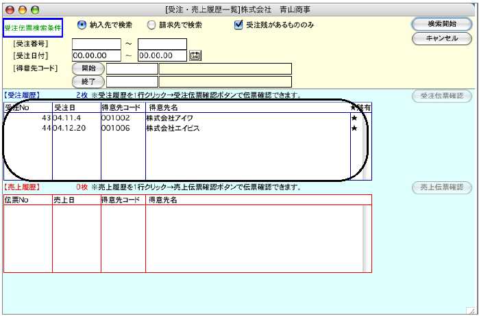 ●受注伝票と、それに対応する売上伝票の履歴を確認することができます。入力内容の訂正はできません。