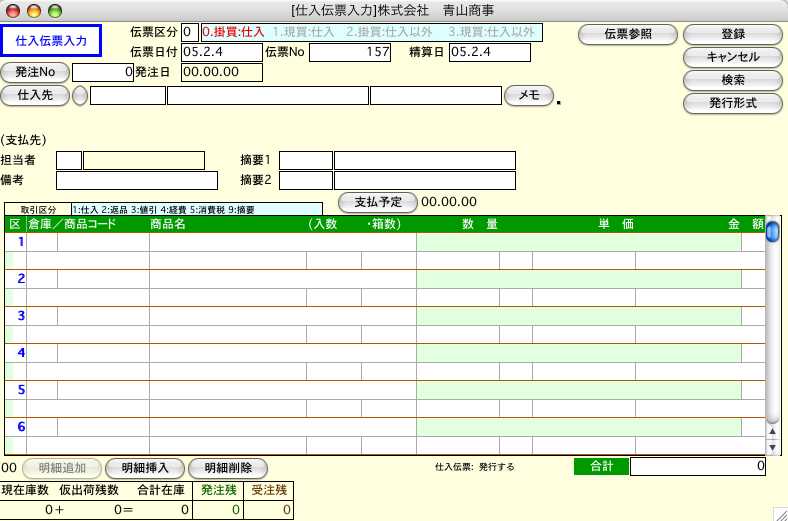 仕入伝票の発行形式は、明細行数5行固定のフォーマットと、入力されている行数だけ印字されるフォーマットの2種類あります。(A4白紙用紙-縦のみ)。返品伝票や社内用伝票として使用してください。