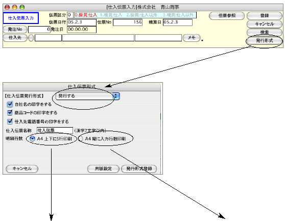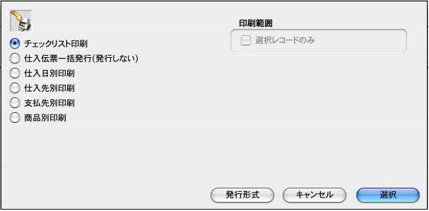 (仕入伝票入力画面で設定の印刷形式で印字されます。変更する場合、「発行形式」ボタンで、印刷用紙の選択をします)