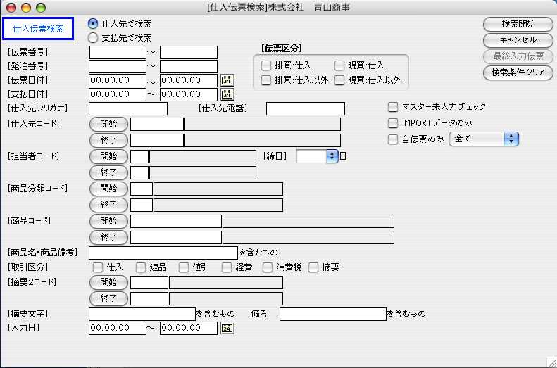 2.仕入伝票検索画面が表示されます。検索条件を入力し、「検索開始」ボタンをクリックします。