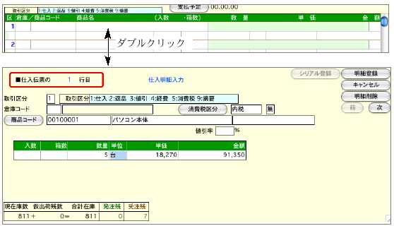 仕入伝票の確認・変更・削除は、その仕入伝票を一覧からダブルクリックして変更画面で操作します。