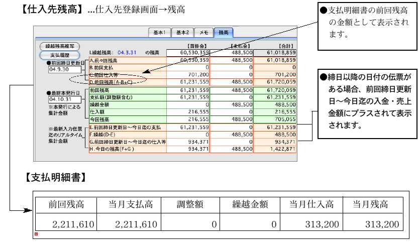 ●支払明細書の本発行時、『設定』タグの仕入先マスターにある残高画面の金額がそのまま支払金額として表示されます。残高画面の金額は伝票を入力する都度更新され、常に正しい金額が計算されています。