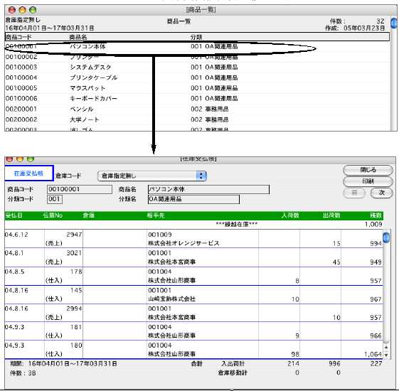 商品明細行ダブルクリックで、在庫受払帳画面へ移ります。