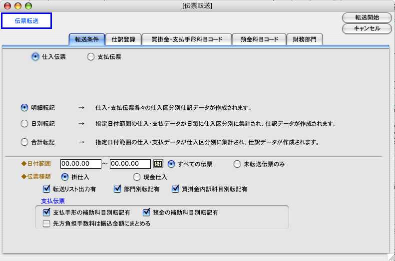 ●伝票転送画面の1項目目の「買掛金内訳科目別転記有」の欄にチェックすると、伝票転送画面の3項目目で 指定した仕入先-補助科目対応表に従い、買掛金の補助科目コードが書き込まれます。チェックをはずすと、買掛金の補助科目は空欄になります。この場合の買掛金コードは3項目目で指定したコードが使用されます。(この場合3項目目の設定内容は、関係ありません)「支払手形の補助科目別転記有」「預金の補助科目別転記有」についても同様です。