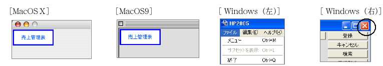 ●ほとんどのメニューは、「閉じる」「キャンセル」「取消し」「登録」等のボタンで終了することが出来ます。これらのボタンを表示していない画面では、画面左 又は 右上のクローズボックスクリックでメニューを終了します。