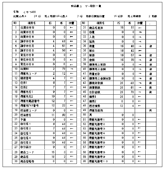 「→」右端の位置指定...伝票No.や、数量、金額等、数値項目は、右詰で印刷されますから、右端の位置を指定します。