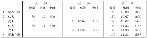 3.移動平均法.......商品を仕入、売上の度、在庫単価を計算する方法です。次の例を参考にしてください。