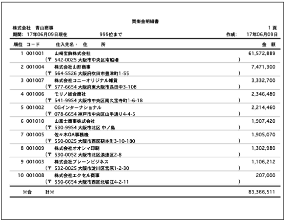 仕入先別の買掛残高と、集計した合計金額を表示、印刷するメニューです。