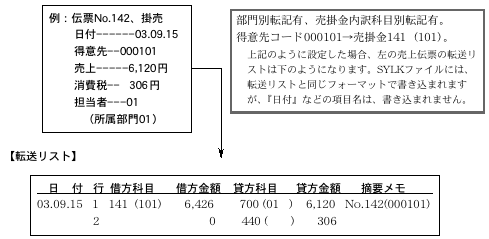 明細転記とは、『販売仕入』の売上伝票1枚を『財務・会計ソフト』の振替伝票1枚に転記する方法です。(部門、内訳転記無の場合、売上帳(伝票計)と照合できます)