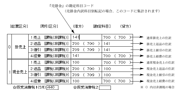 ●掛売上と現金売上と入金それぞれについて、取引区分別の仕訳を指定します。勘定科目コードは『財務管理』ソフトで使用している勘定科目のユーザーコード(3桁または4桁)で指定します。指定された勘定科目コードや、仕訳について、エラーチェック等は、かかりませんので注意してください。