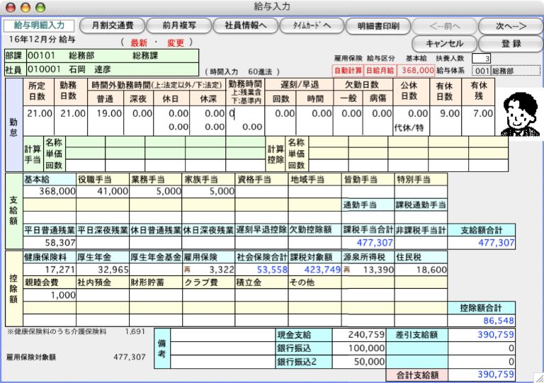 社会保険料・源泉所得税・残業手当・欠勤控除・遅刻早退控除・現金,振込1,振込2の計算は自動計算されませんので、これらはすべて手入力します。
