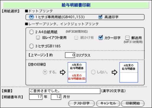 給与明細書、賞与明細書の用紙選択画面に、「カラー印字」のチェックボックスをチェックすると、カラー(本人に渡すもの:緑、控:青)で印字されます。