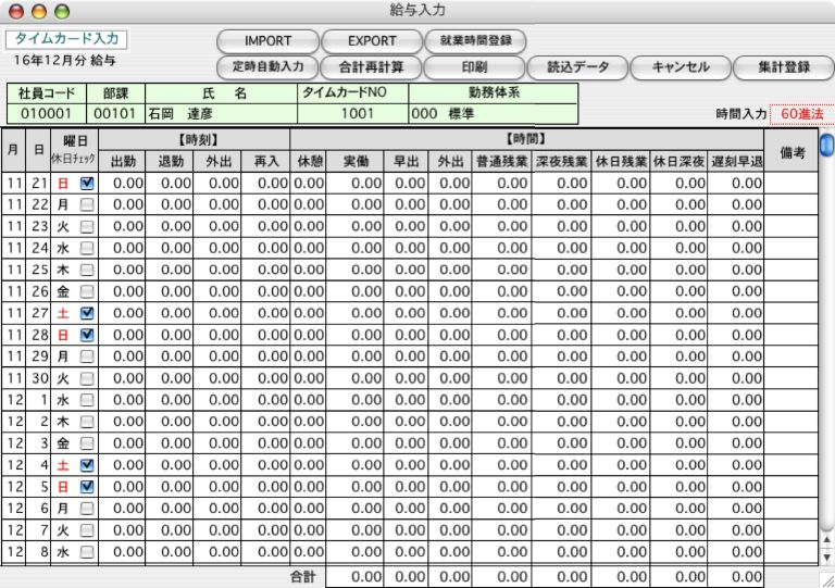 タイムカード入力後、「集計登録」ボタンをクリックすると、各項目の合計が計算され、「1」の画面に戻ります。