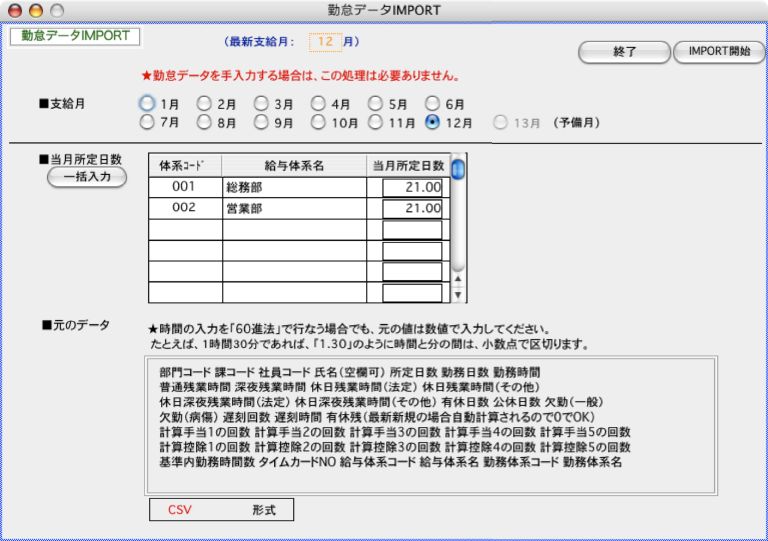 3.支給月を選択し、当月所定日数を入力します。次に、「IMPORT開始」ボタンをクリックします。