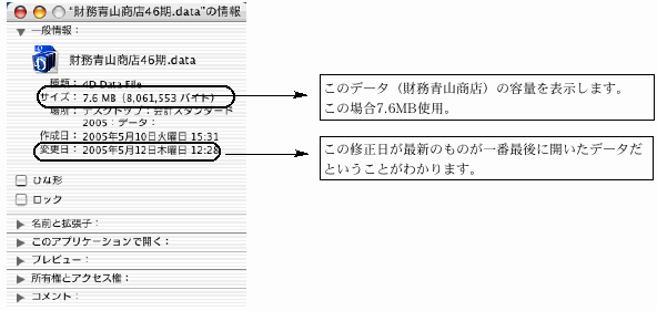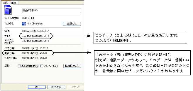 バックアップコピーをとるときには、ハードディスクにデータの容量(「○○.4DD」と「○○.4DR」の合計)以上の空きがないと、コピーできません。 容量をみるには、それぞれのアイコンを1回クリックして反転させ、ファイルメニューから、「プロパティ」を選択します。