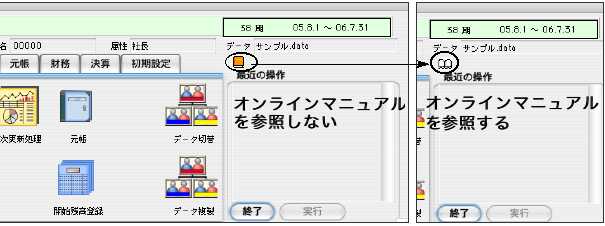 「本」アイコンが閉じた状態では「オンラインマニュアルを参照しない」、