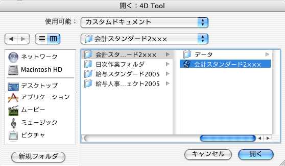 2.Macintosh:「会計スタンダード2×××」フォルダを選択、「会計スタンダード」プログラムを黒く反転させ、『option』キーを押しながら「開く」ボタンをクリックします。