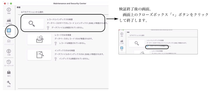 ○ 「Maintenace & Security center」によるデータの「検査」「修復」「圧縮」操作方法