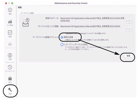 「ファイルメンテ」メニューの操作を行っても、データエラーが表示される場合、以下の操作をすることでデータの修復作業を実行し、