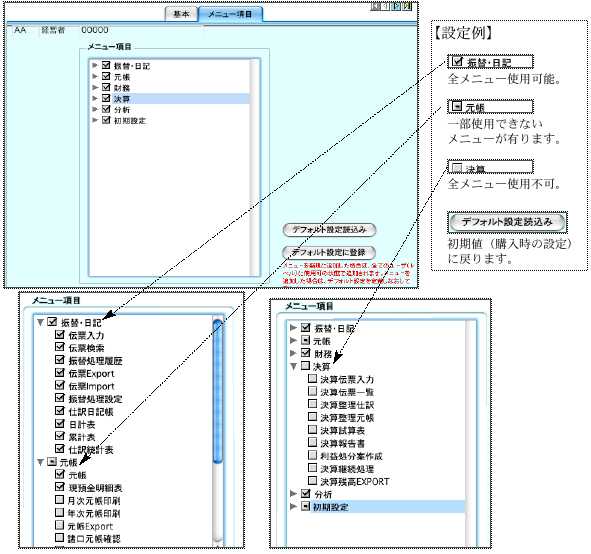 メニュー項目毎に、表示できるメニューを設定することができます。