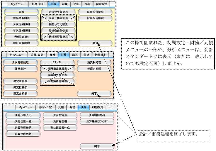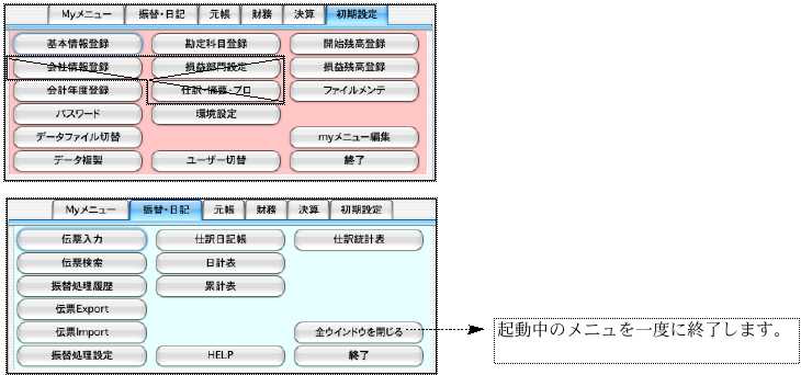 メニューを全部一度に閉じるには、振替・日記メニューから『全ウィンドウを閉じる』ボタンを押します。