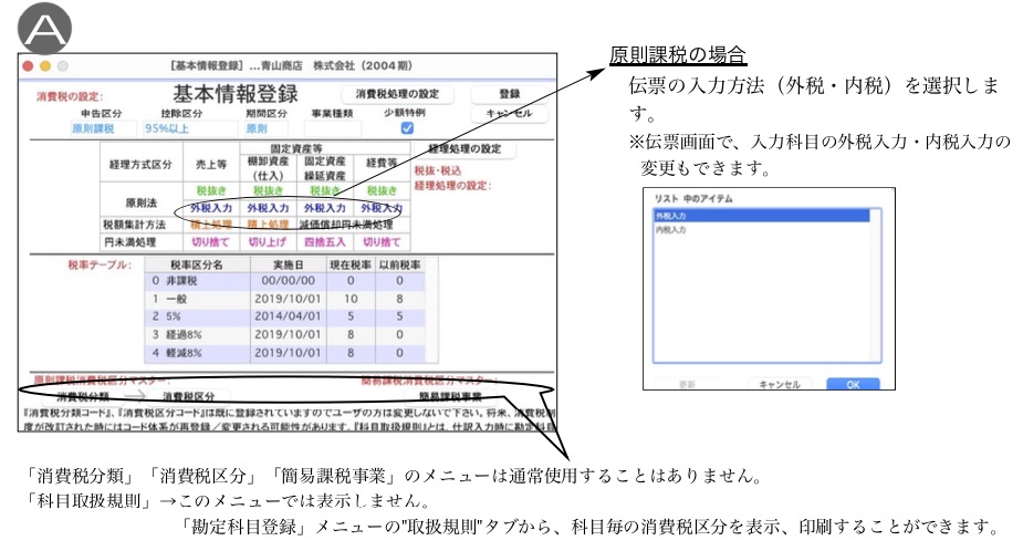 原則課税.........伝票入力の金額を、消費税額抜き(外税)で入力するか、消費税込み(内税)で入力するかの選択をします。 これは科目分類(売上/固定資産/経費)毎に設定できます。