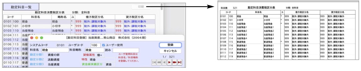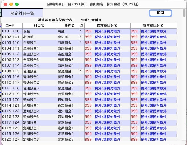 ※一覧画面に何も表示されない場合でも、行選択→ダブルクリックの操作で、科目登録画面に変わります。 全科目の消費税区分を確認したい場合、「印刷(横方向100%)」を実行します。