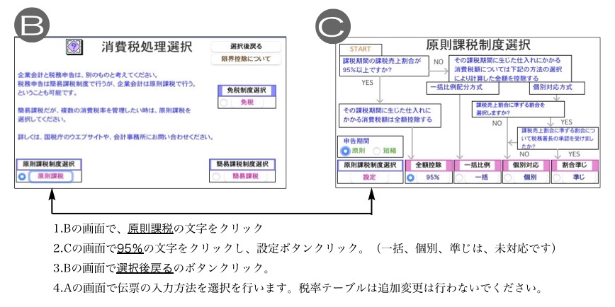 A.の画面右上、「消費税処理の設定」をクリック、「消費税処理選択」画面で、『原則課税・簡易課税・免税』のいずれかを選択→設定ボタンをクリックするだけで、課税制度の選択は終了です。