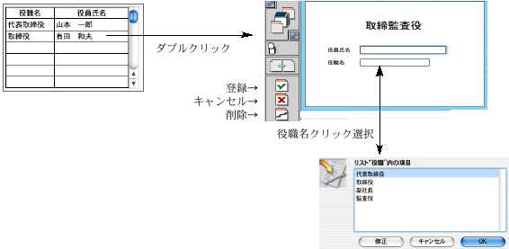 「役職名」「役員氏名」の追加・修正・削除:「役職名」と「役員氏名」の間をダブルクリックして登録画面を表示します。