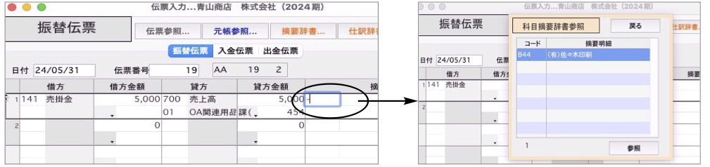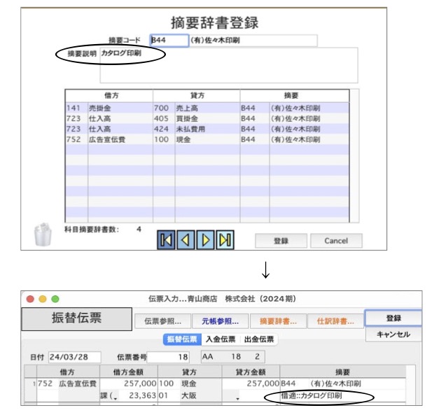 例:摘要辞書登録画面で「摘要コード→(有)佐々木印刷」、「摘要説明→カタログ印刷」と登録すると、伝票入力時、