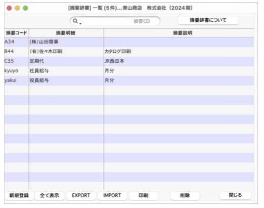登録した摘要辞書の印刷、修正、削除をこのメニューで行います。(コード→半角5桁。入力文字数は全角20文字)