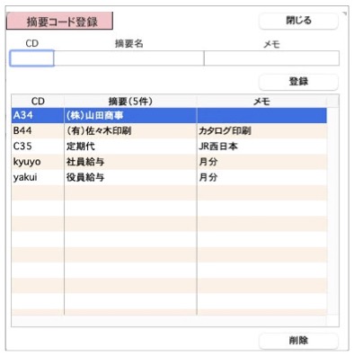 例えば、摘要コードをA001,A002,A003,..., B001,B002,B003,..., の様にアルファベットの混じったコードを登録する事も可能です。
