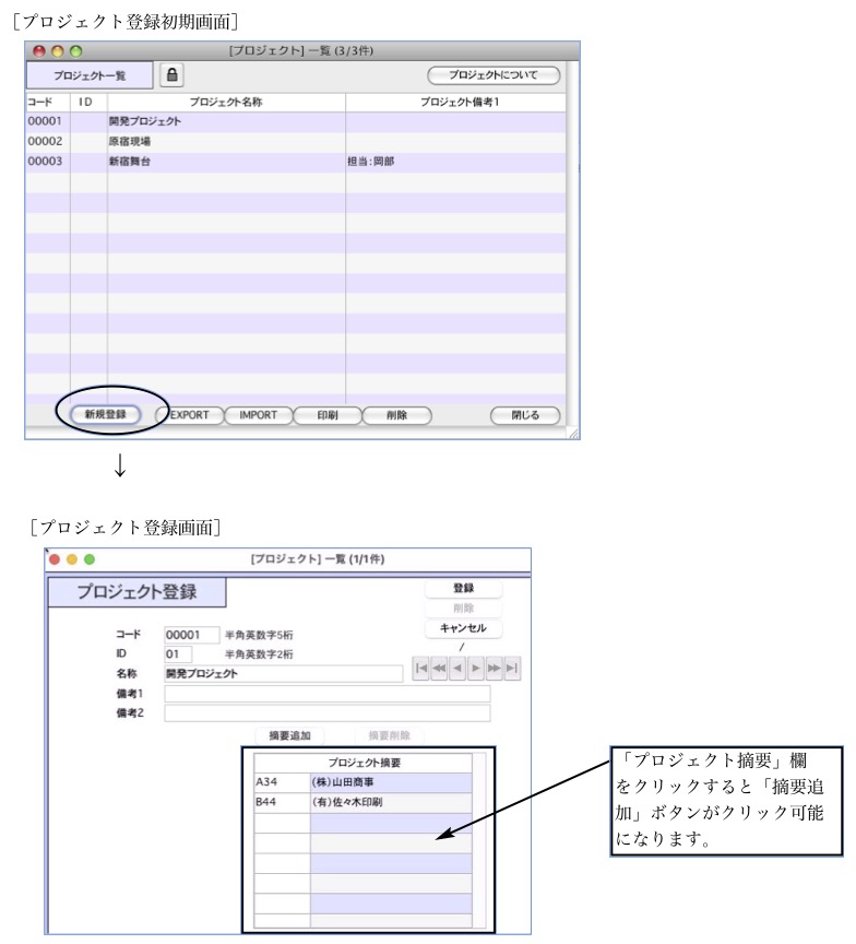 ・初期設定 メニューから『仕訳・摘要・プロ』ボタンクリック→「プロジェクト登録」を選択します。