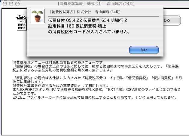 原則課税に設定しているのに、税区分コードが空白の仕訳があれば、仕訳訂正画面を表示しますので、税区分コードを入力します。