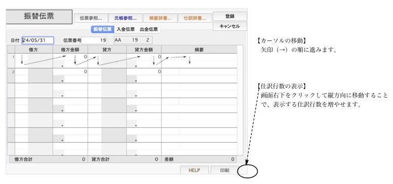 科目・金額・摘要コード/メモの各入力欄で入力する際の、キー入力の仕方を簡単に説明していますので、仕訳入力の参考にしてください。
