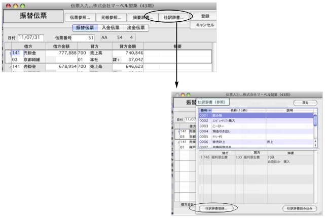 仕訳明細を入力後(または、入力済みの伝票を表示して)、"仕訳辞書"ボタンをクリックします。