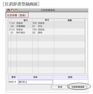 最初、左頁[仕訳辞書登録画面]と同じ画面を表示します。
