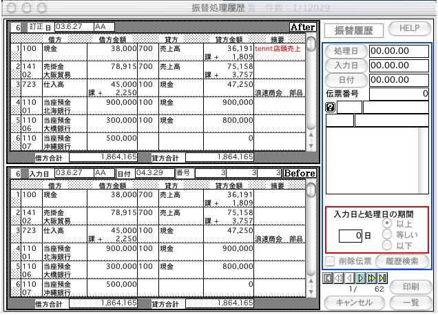 [振替処理履歴初期画面] 上が変更後の伝票、下が変更前の伝票を表示します。(変更箇所は、赤文字で表示します。)