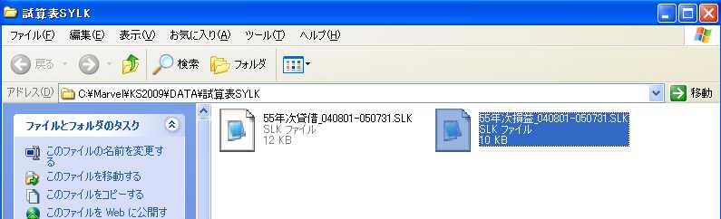 これらのファイルの保存先である「試算表SYLK」フォルダ内に、データファイルが作成できているのを確認する画面を表示します。このファイルを使用しない場合、このフォルダを閉じてください。