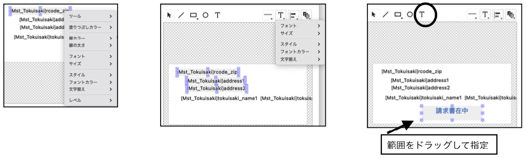 ・ラベルに自由文字を入力したい場合は、設計アイコンの左側「T」をクリック後、ラベル部分で範囲を