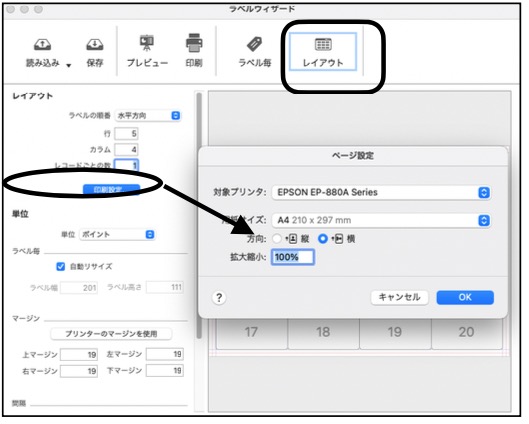 「レイアウト」では、ラベル用紙の用紙サイズやマージンの設定を行います。