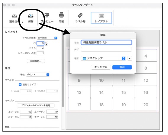 5.印刷を確認後、今回のラベル設計を保存したい場合は、「保存する」ボタンをクリックし、保存ファイル名を入力後、保存先を指定して設計値をファイルに保存します。