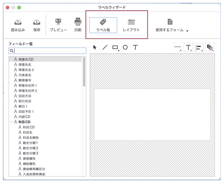 ラベルエディタには2つのタグ「ラベル」と「レイアウト」があります。