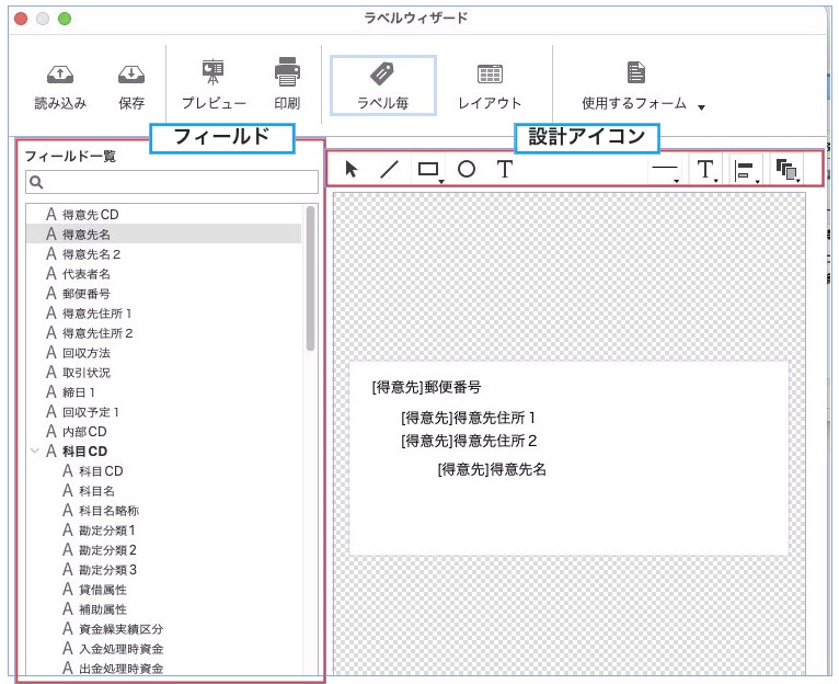 1.左側のフィールドからラベルに印字したい項目を選択し、ドラッグ&ドロップで右側のラベル画面に設計します。
