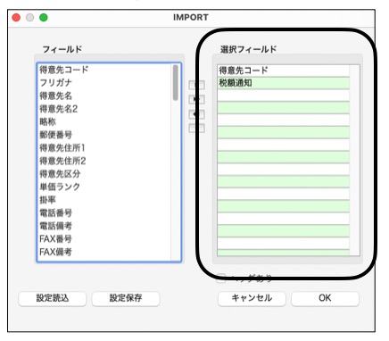 6.以下の画面が表示されます。選択フィールドをEXPORT時の項目の並びと同様にセットし、「OK」ボタン