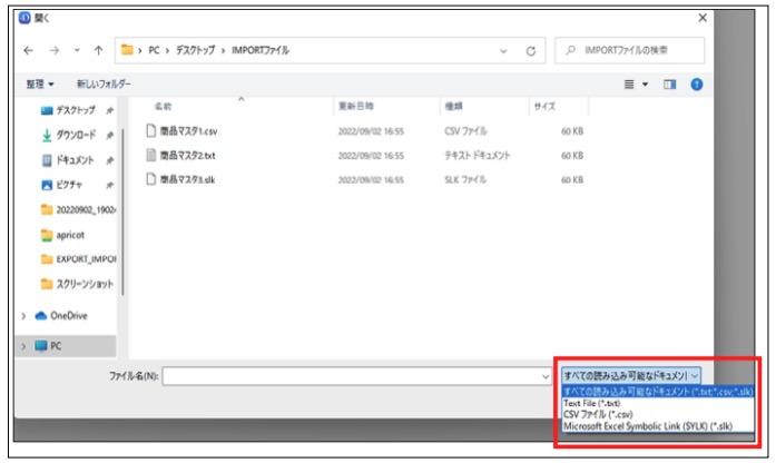 *想定外の拡張子のファイルを選択した場合、「環境設定」で設定しているIMPORT形式と見直してIMPORTを行います。