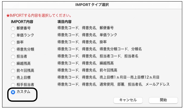 得意先項目別を選択後、「カスタム」を選択し、開始をクリックします。